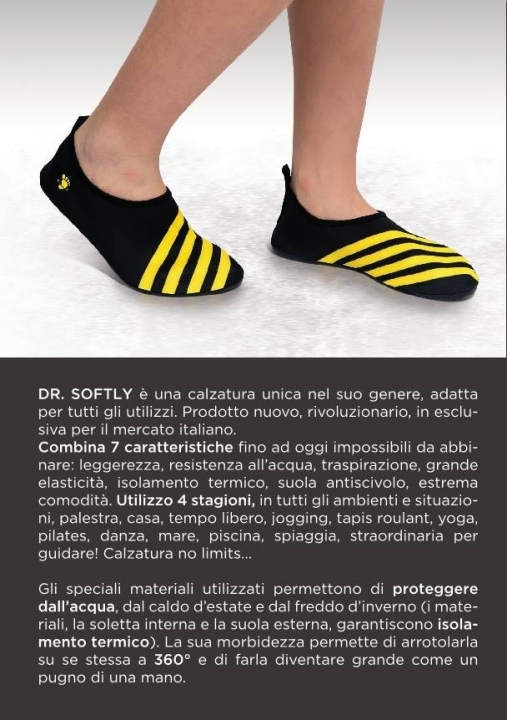 Dr. Softly è una calzatura unica nel suo genere, adatta per tutti gli utilizzi. Prodotto nuovo, rivoluzionario, in esclusiva per il mercato italiano. Combina 7 caratteristiche fino ad oggi impossibili da abbinare: leggerezza, resistenza all’acqua, traspirazione, grande elasticità, isolamento termico, suola antiscivolo, estrema comodità. Utilizzo 4 stagioni, in tutti gli ambienti e situazioni, palestra, casa, tempo libero, jogging, tapis roulant, yoga, pilates, danza, mare, piscina, spiaggia, straordinaria per guidare! Calzatura no limits...